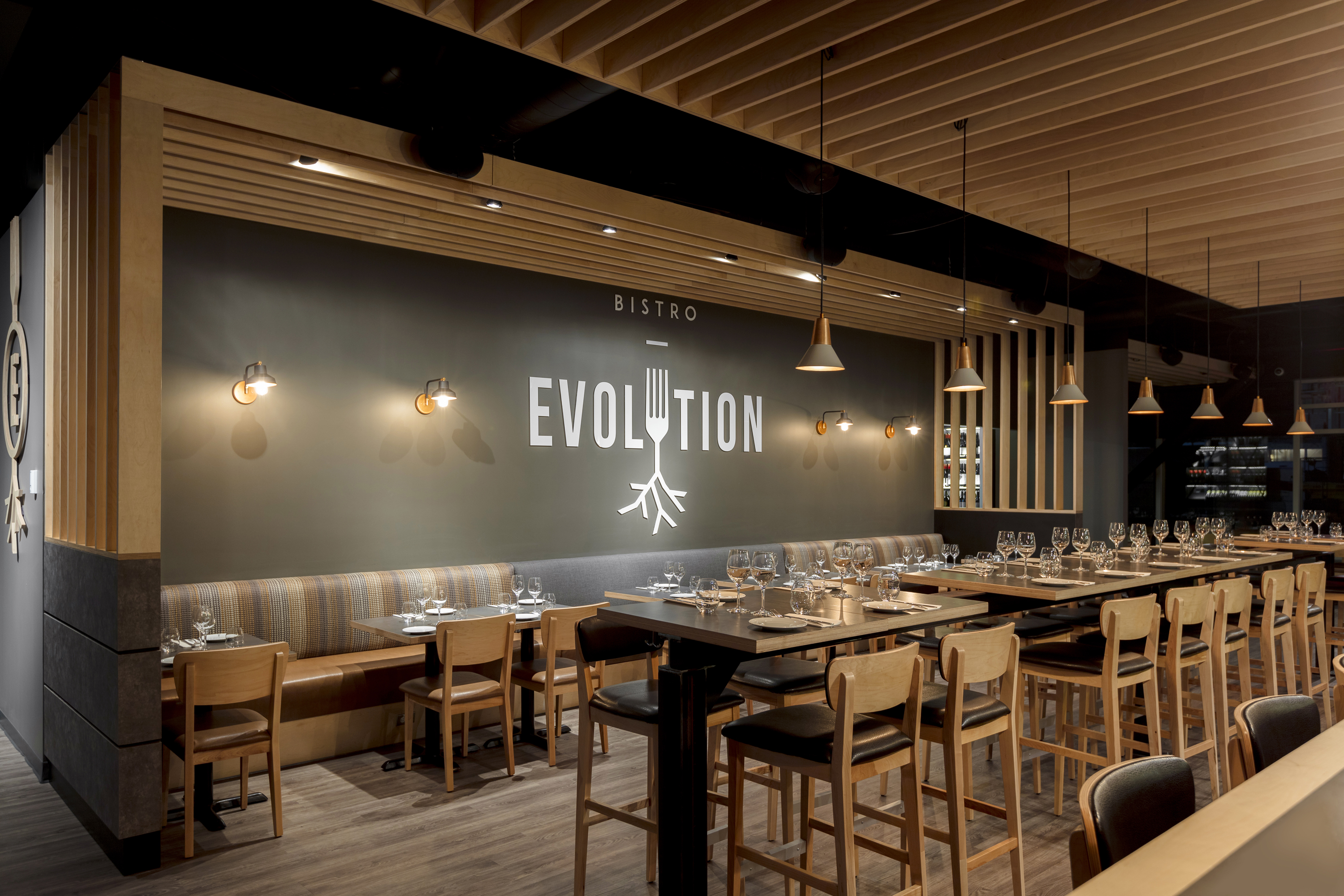 La forte présence du bois découle directement du nom de ce restaurant : Évolution. En effet, au cours de son cycle de vie, ce matériau évolue en prenant différentes formes, c'est pourquoi il a été utilisé dans de nombreux aspects de ce projet. L'espace est principalement caractérisé par l'agencement de lames de bois qui définissent les zones d'activités et les zones de circulation. À la fois écran d'intimité et plafond texturé, le bois confère une ambiance chaleureuse et conviviale. La palette de couleurs terre et les luminaires composés de matériaux bruts complètent l'aménagement du restaurant.